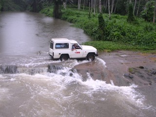 Com toda a chuva que tinha caído desde a manhã, estávamos algo apreensivos quanto à possibilidade de travessia dos dois rios em que as pontes estão quebradas. Por brincadeira dizíamos que, mal por mal, teria sido melhor termos ficado presos no Ilhéu das Rôlas (onde há um hotel de quatro estrelas) do que a meio caminho entre Porto Alegre e Angoalres. Na primeira travessia, a água quase chegava ao nível da ponte provisória, mas a passagem era fácil. Na segunda, a água já tinha galgado a ponte. Parámos o jipe e fomos verificar o nível da água. Era de trinta a quarenta centímetros, pelo que não chegava à altura do tubo de escape do jipe (se o tubo de escape de um carro ficar debaixo de água o motor pára), o que nos permitia atravessar.